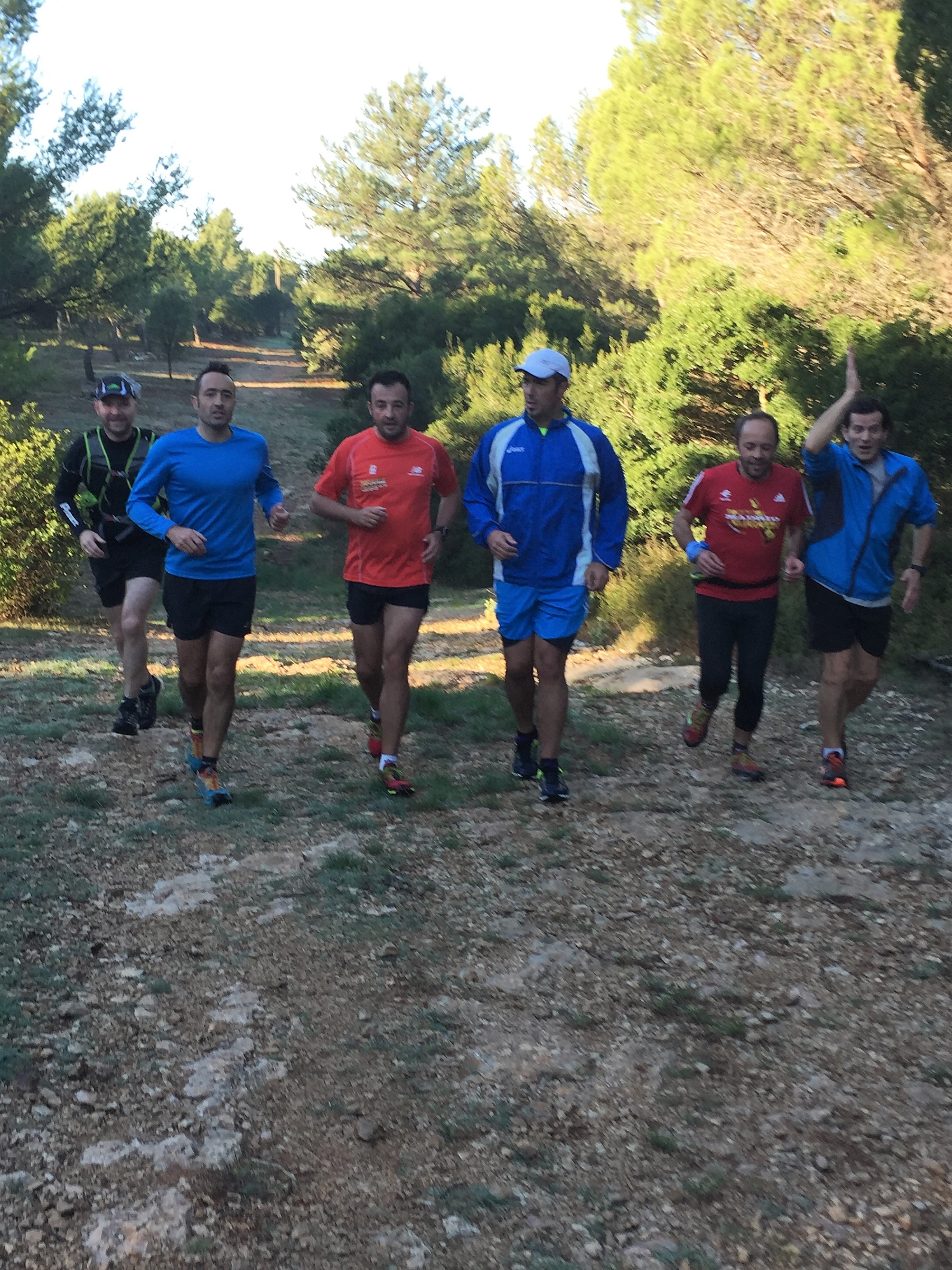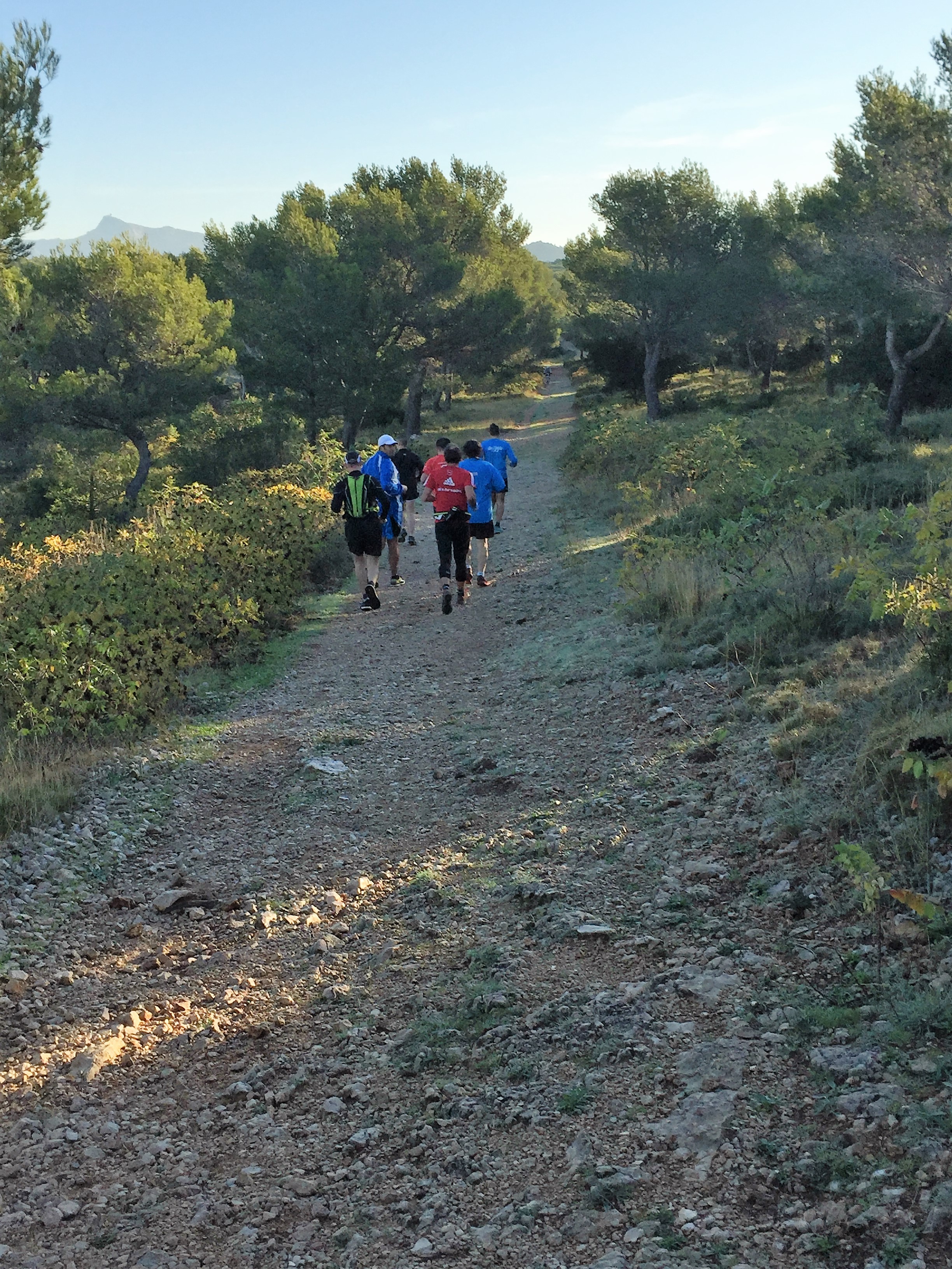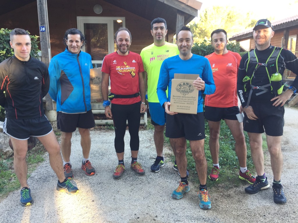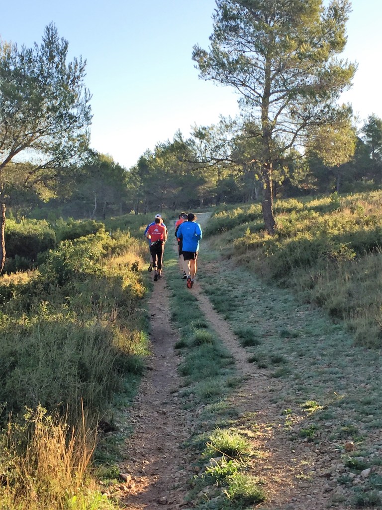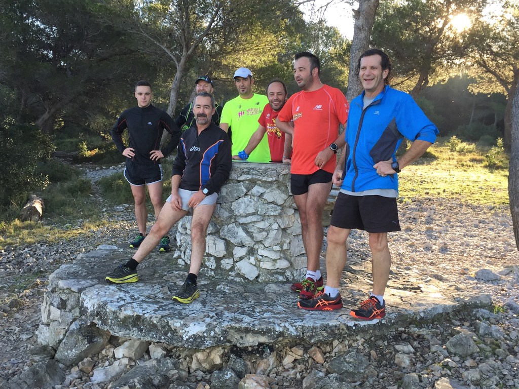 Départ avec les Moons’joggers devant les chalets du campings sur les hauts de Carnoux. Petite mise en jambes la veille de Marseille Cassis après une soirée confits de canard le jeudi et aligot de l’Aubrac le vendredi ! C’est sûr , on ne va pas manquer de vitamines ! Heureusement, on a porté de quoi s’hydrater !