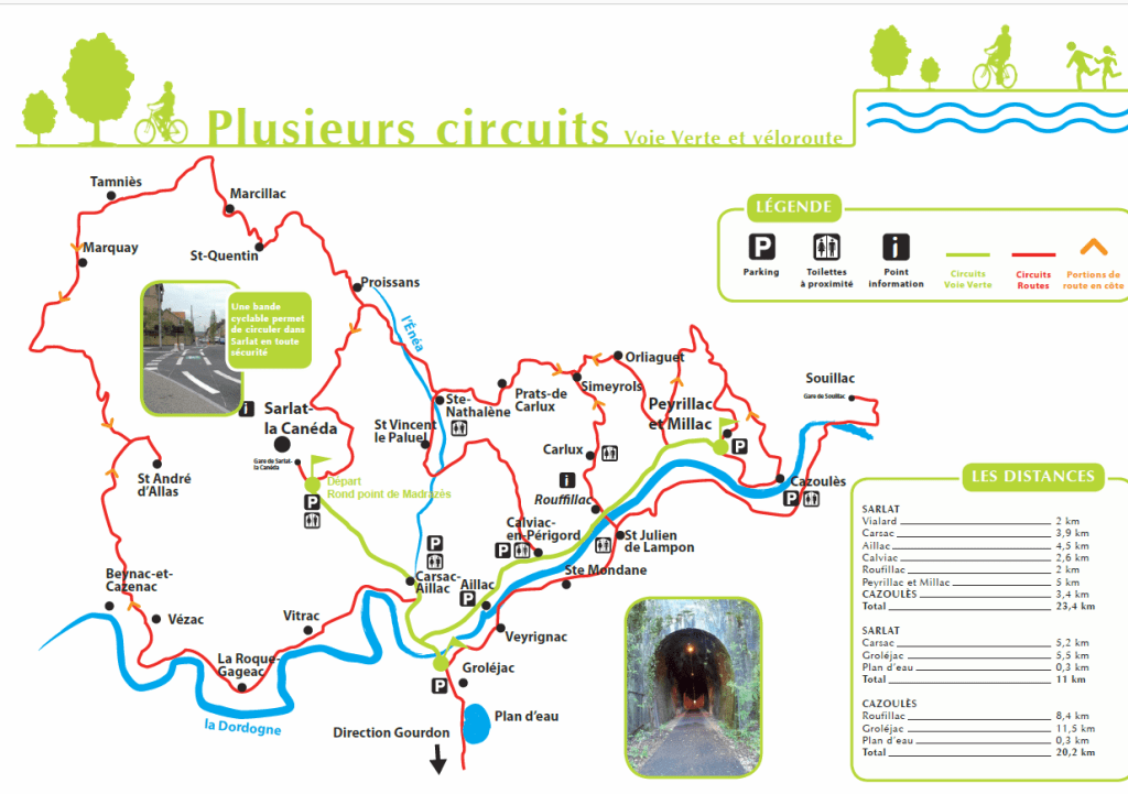 Vous cherchez un endroit calme,tranquille, ombragé, sans difficulté, pour marcher, courir, roller, skateborder, bicycleter …. seul, à deux, en famille, entre amis; alors, faites une escapade en Périgord du côté de Sarlat: la voie verte est toute à vous!