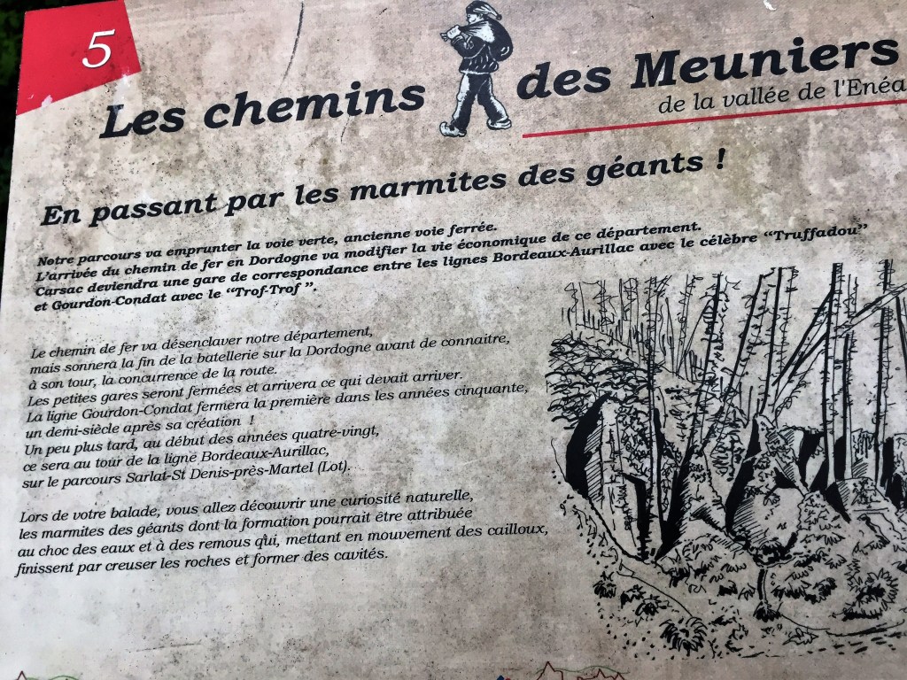 La voie verte est une ancienne voie de chemin de fer qui a été aménagée entre Sarlat, Groléjac et Cazoulès ( 3 km de Souillac ) ou plus précisément DES anciennes voies comme me l’a appris cette pancarte: la ligne Bordeaux Aurillac avec le » TRUFFADOU » et la ligne Gourdon Condat avec le » TROF-TROF » !!!!