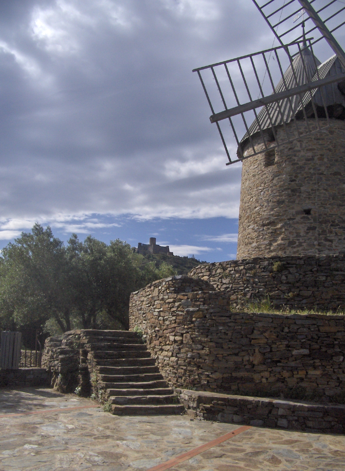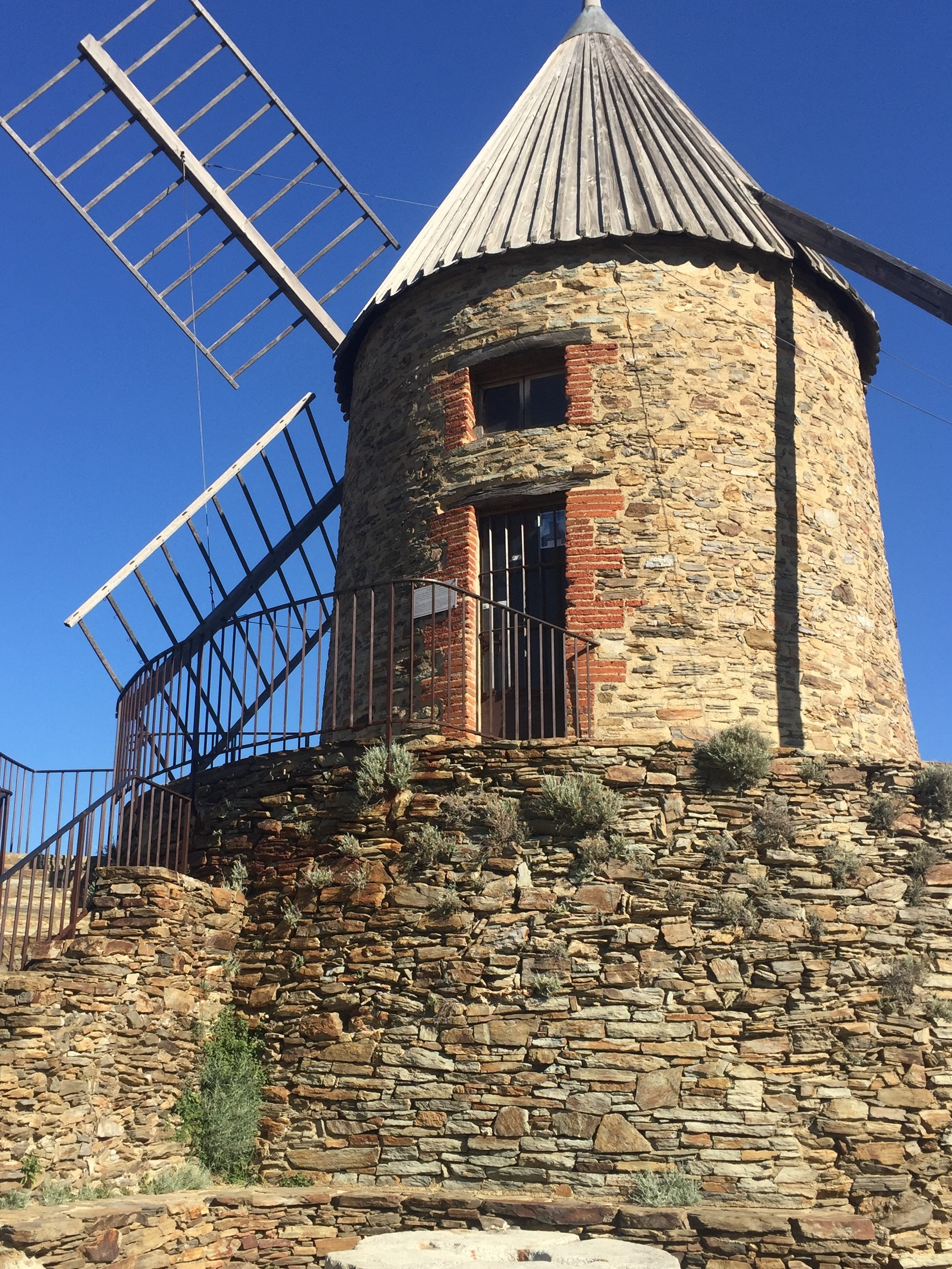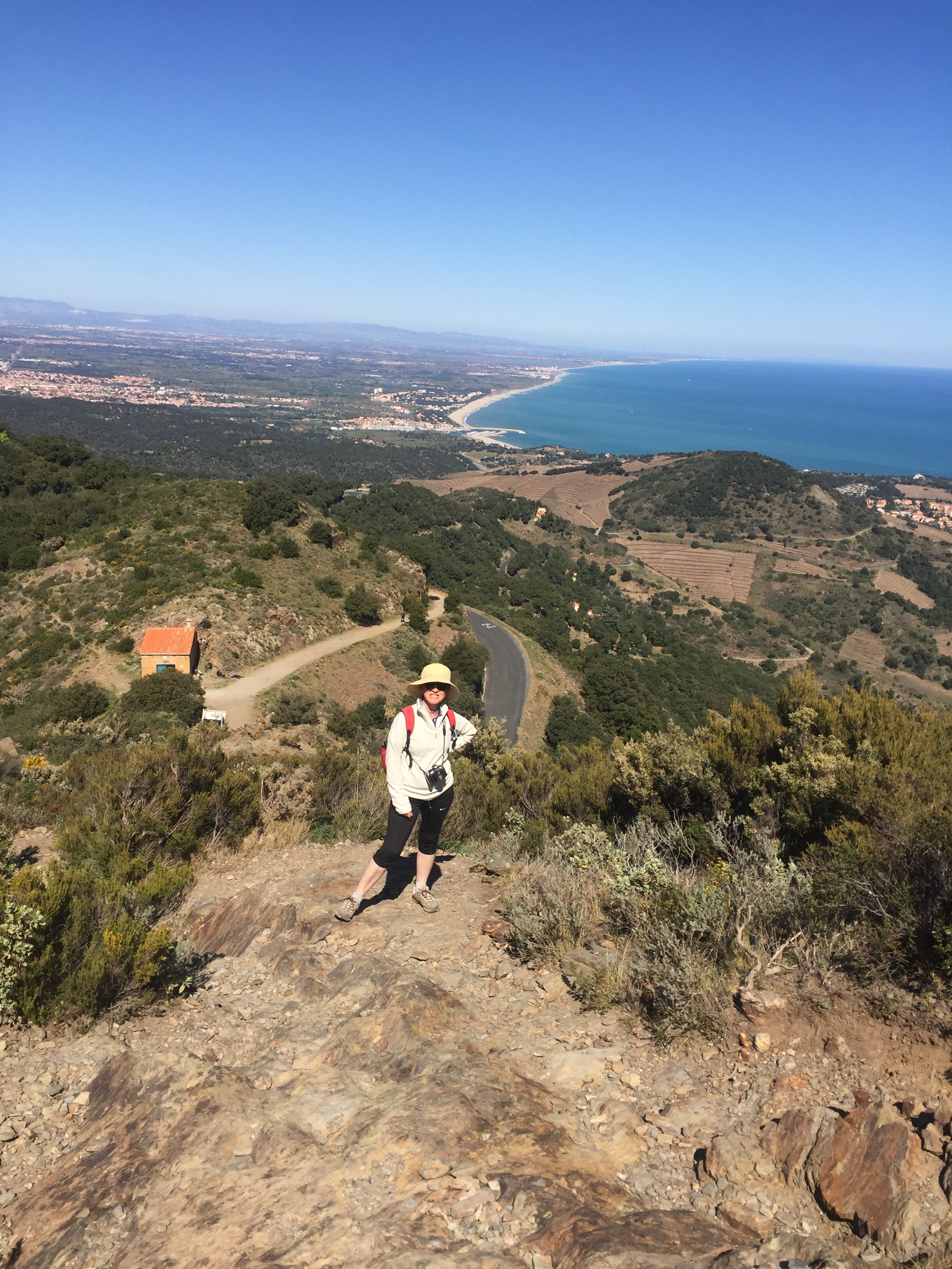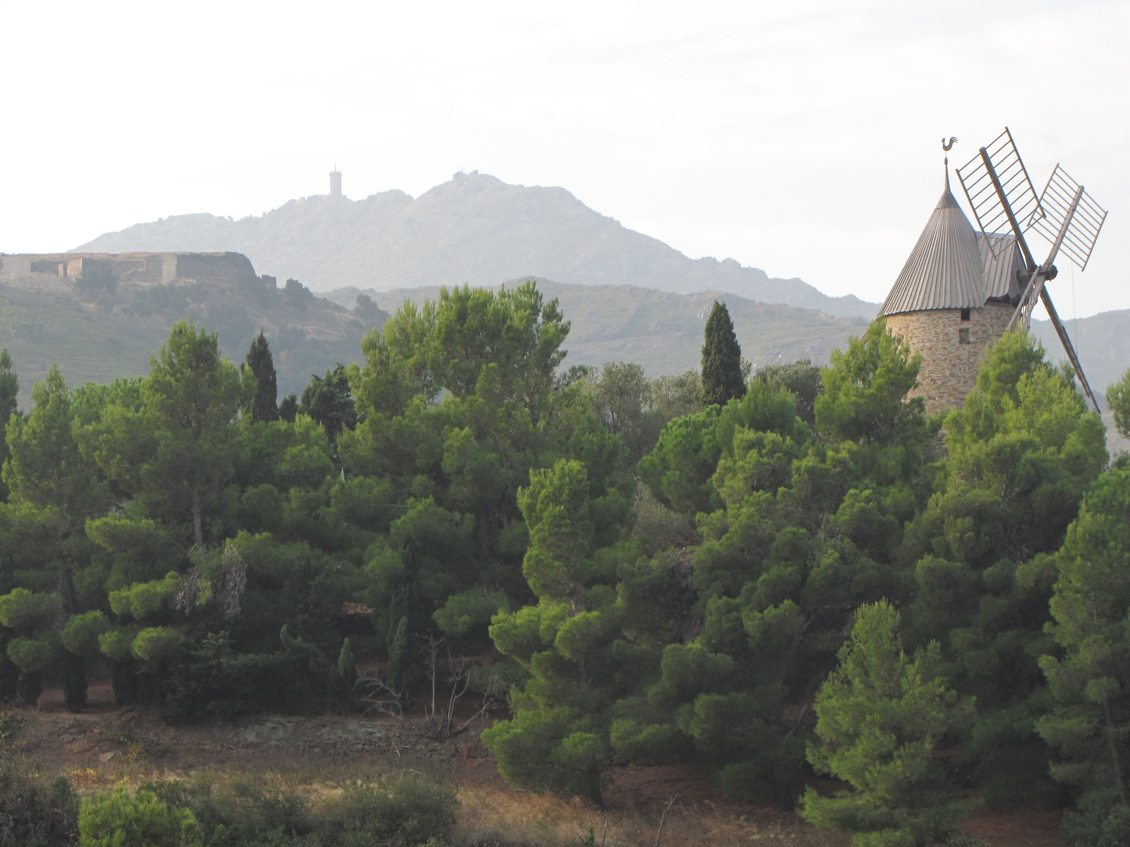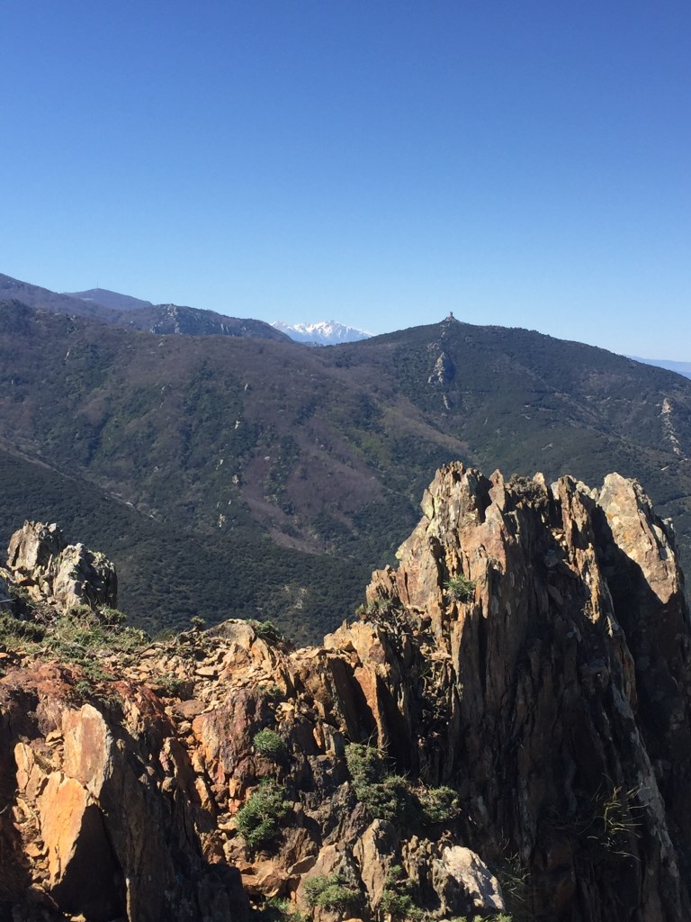 Mais non, j’exagère; de là, on a une super vue à 360 °: toute la côte de St Cyprien à Cerbère, les Pyrénées, les neiges du Canigou et l’Espagne. La tour construite au XIII ° siècle avait pour mission de relayer les signaux entre le nord et le sud de la Catalogne … aujourd’hui, relais aussi mais de télévision ! Bon, on a quand même fait une bonne grimpette !